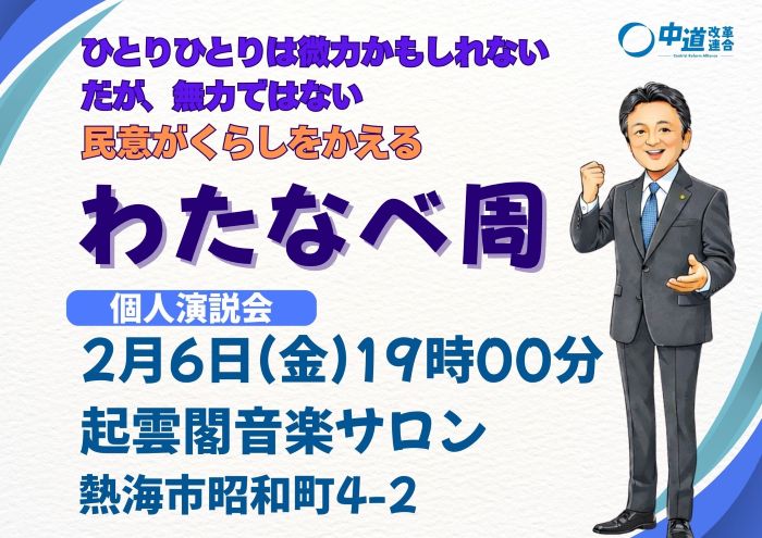 2月6日(金)午後7時 起雲閣音楽サロンにて『 わたなべ周 個人演説会 』